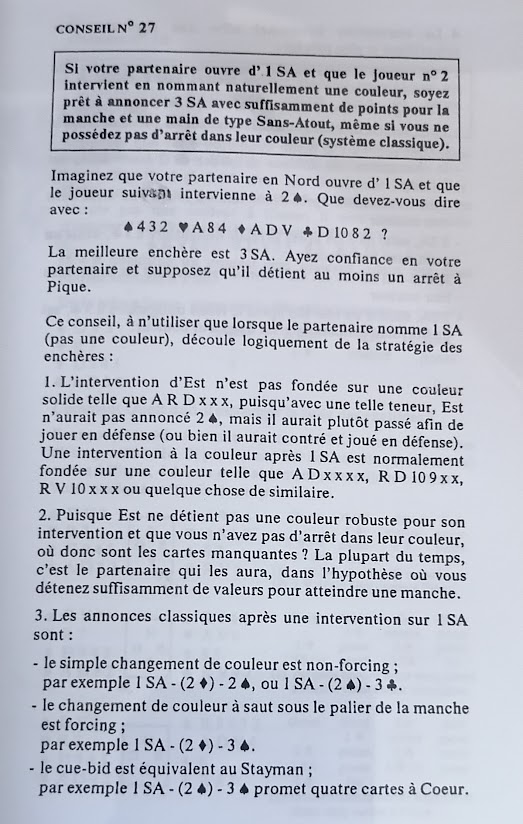 27 : Si votre partenaire ouvre d' 1 SA et que le joueur n°2 intervient en nommant une couleur, soyez prêt à annoncer 3 SA avec suffisamment de points pour la manche et une main de type Sans Atout, même si vous ne possédez pas d' arrêt dans leur couleur (système classique).